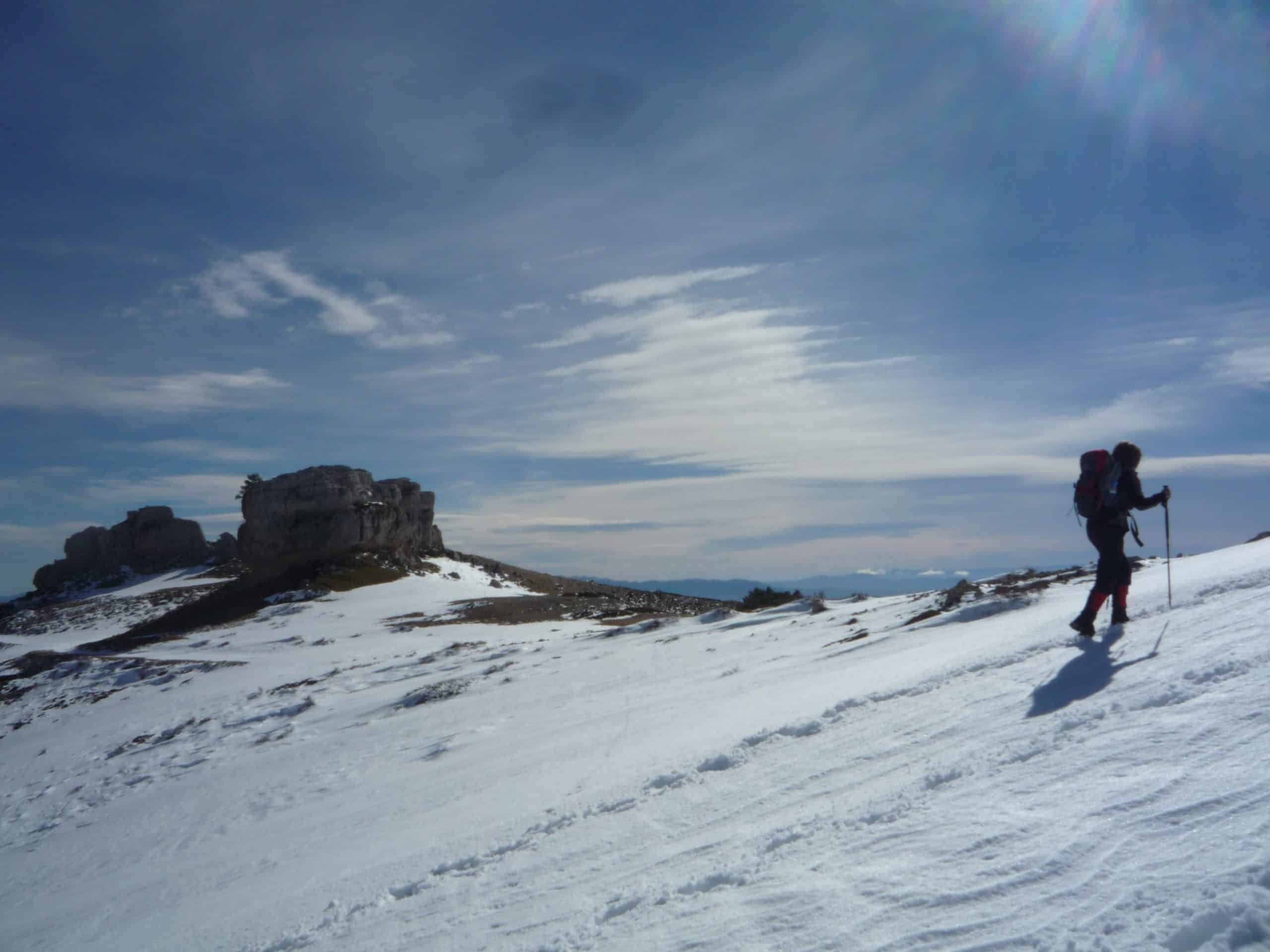 La tarjeta federativa en la mochila, con abundante agua. Ropa de abrigo apropiada al tiempo (estamos en invierno) y al lugar, chaqueta con membrana impermeable, botas o zapatillas de montaña en buenas condiciones.
