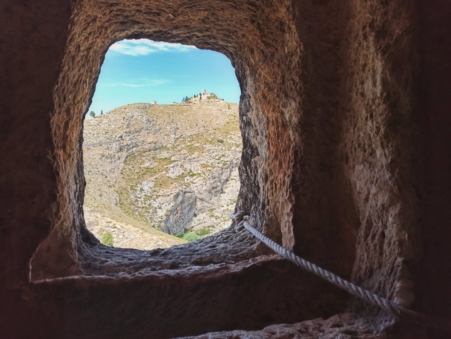 Desde la Ermita del Santo Cristo se disfruta de una espectacular panorámica que abarca Les Covetes, Bocairent, su emblemático puente y la Sierra de Mariola como telón de fondo.