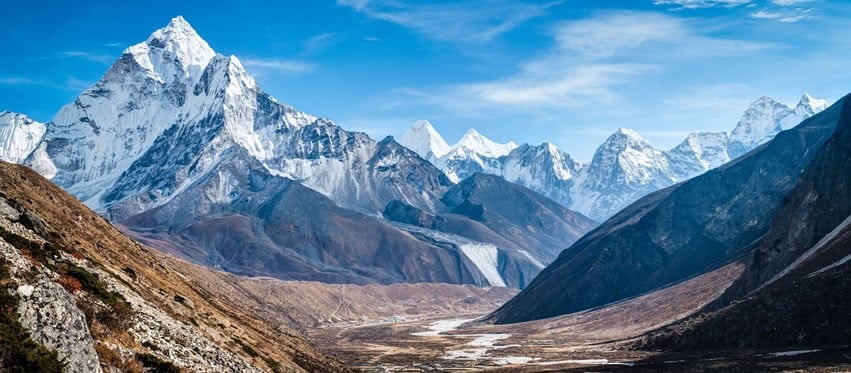 De los 143.000 km2 que conforman el territorio de Nepal, un 85% es montañoso y acoge a ocho de las catorce cimas que existen en la Tierra con una altitud superior a los 8.000 m: Everest (8.848 m), Kanchenjunga (8.584 m), Lhotse (8.501 m), Makalu (8.475 m), Dhaulagiri (8.167 m), Manaslu (8.163 m), Cho Oyu (8.153 m) y Annapurna (8.090 m). Éste es sin duda uno de los mayores atractivos de este país asiático, atrapado por la imponente cadena del Himalaya. Los límites del Himalaya no están definidos de una manera uniforme y en general se conoce por este nombre a las cadenas de montañas situadas entre el valle del Indo al oeste y el del Brahamaputra al este. En comparación con los demás macizos del globo, el Himalaya es relativamente joven: se calcula que se formó a finales de la época mesozoica (final de la Era Secundaria) hace aproximadamente 80 millones de años. La tesis generalmente más admitida en nuestros días es que el estrato terrestre sobre el cual reposaba Tethys (nombre dado al vasto océano que recubría el norte del bajo-continente indio) tropezó con las masas continentales de lo que hoy es China. Este deslizamiento y este tropiezo hicieron a la vez desaparecer el océano original y formar las cimas himaláyicas que cubren hoy una superficie de medio millón de kilómetros cuadrados.